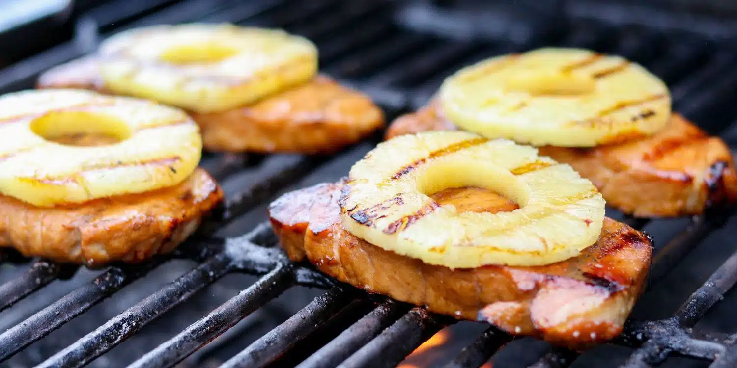 | Pineapple Grilled Pork Chops | Juicy pork chops unleashed with a sweet marinade and grilled to perfection, topped with grilled pineapple rings. |